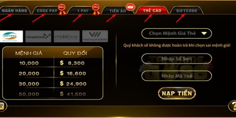 - Nền tảng hỗ trợ nhiều phương thức nạp tiền khác nhau, bao gồm thẻ cào điện thoại, chuyển khoản ngân hàng, ví điện tử và thẻ tín dụng. Tuy nhiên, không phải tất cả các phương thức đều phù hợp với tất cả người chơi hoặc tình huống. Trước khi nạp tiền, bạn nên xác định phương thức nào là thuận tiện, phù hợp nhất với nhu cầu của mình.